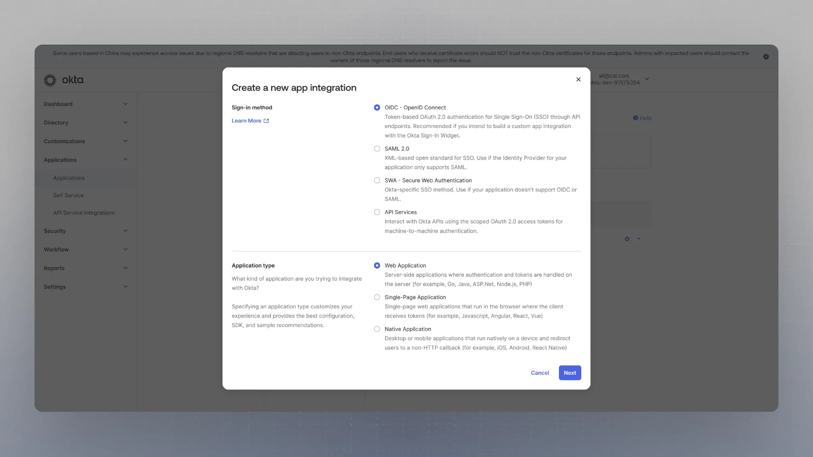 Select SAML or OIDC in the modal form, along with Web App and click Next.
