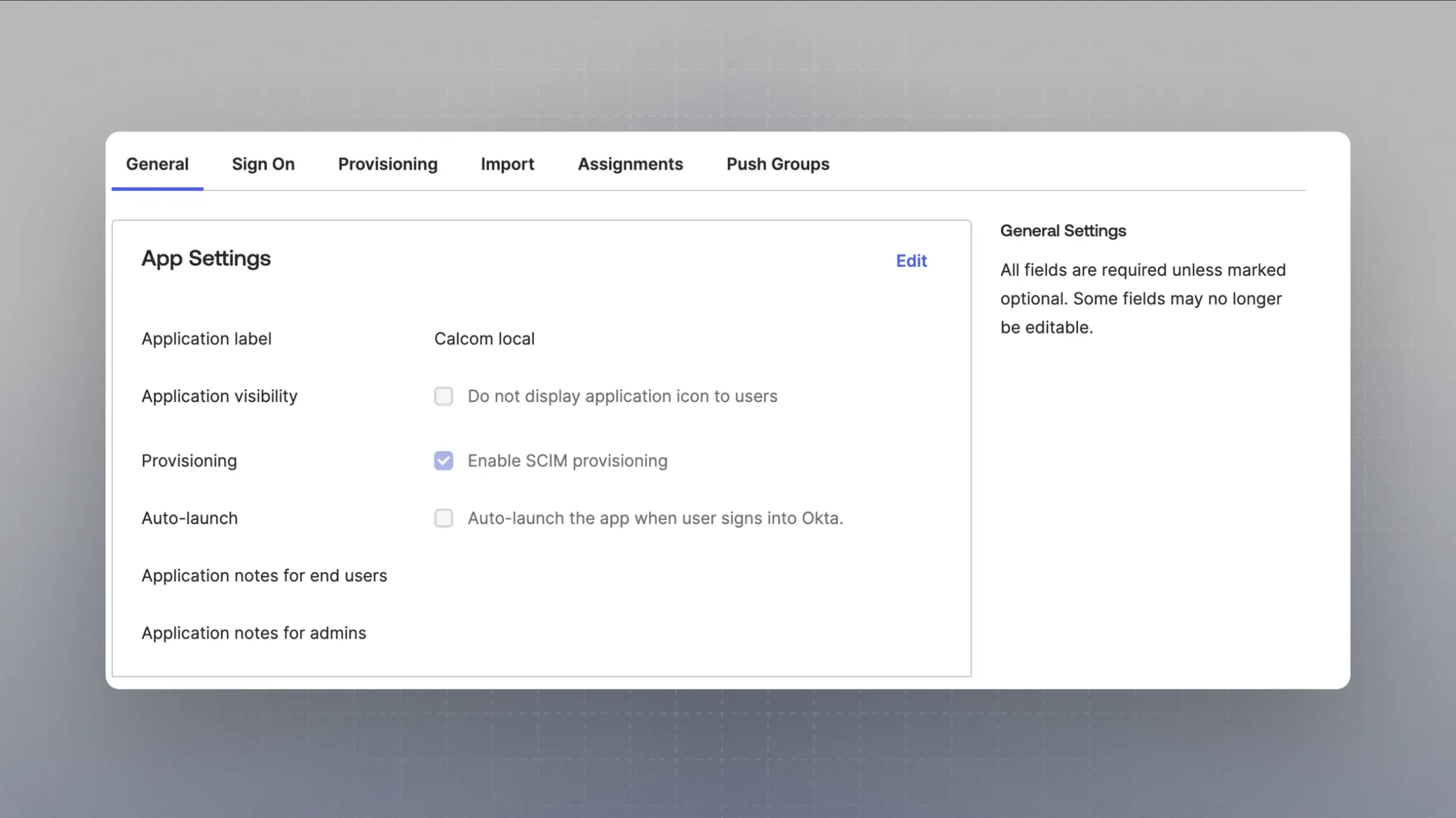 Once the application is created, under General -> App Settings, click “Edit” and click the checkbox “Enable SCIM provisioning”