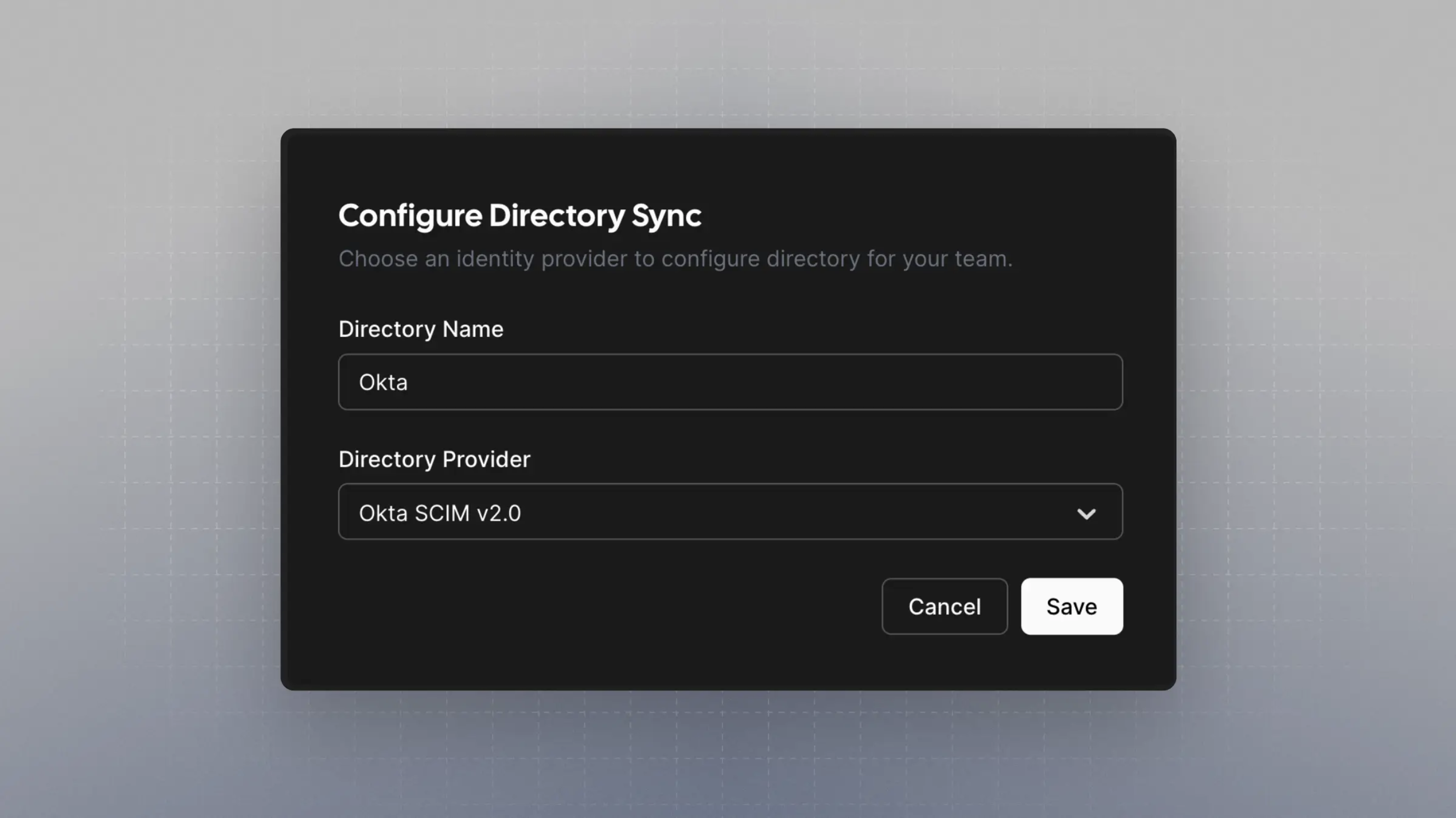 In the “Configure Directory Sync” from choose a directory sync name and choose “Okta SCIM v2.0” as the “Directory Provider”