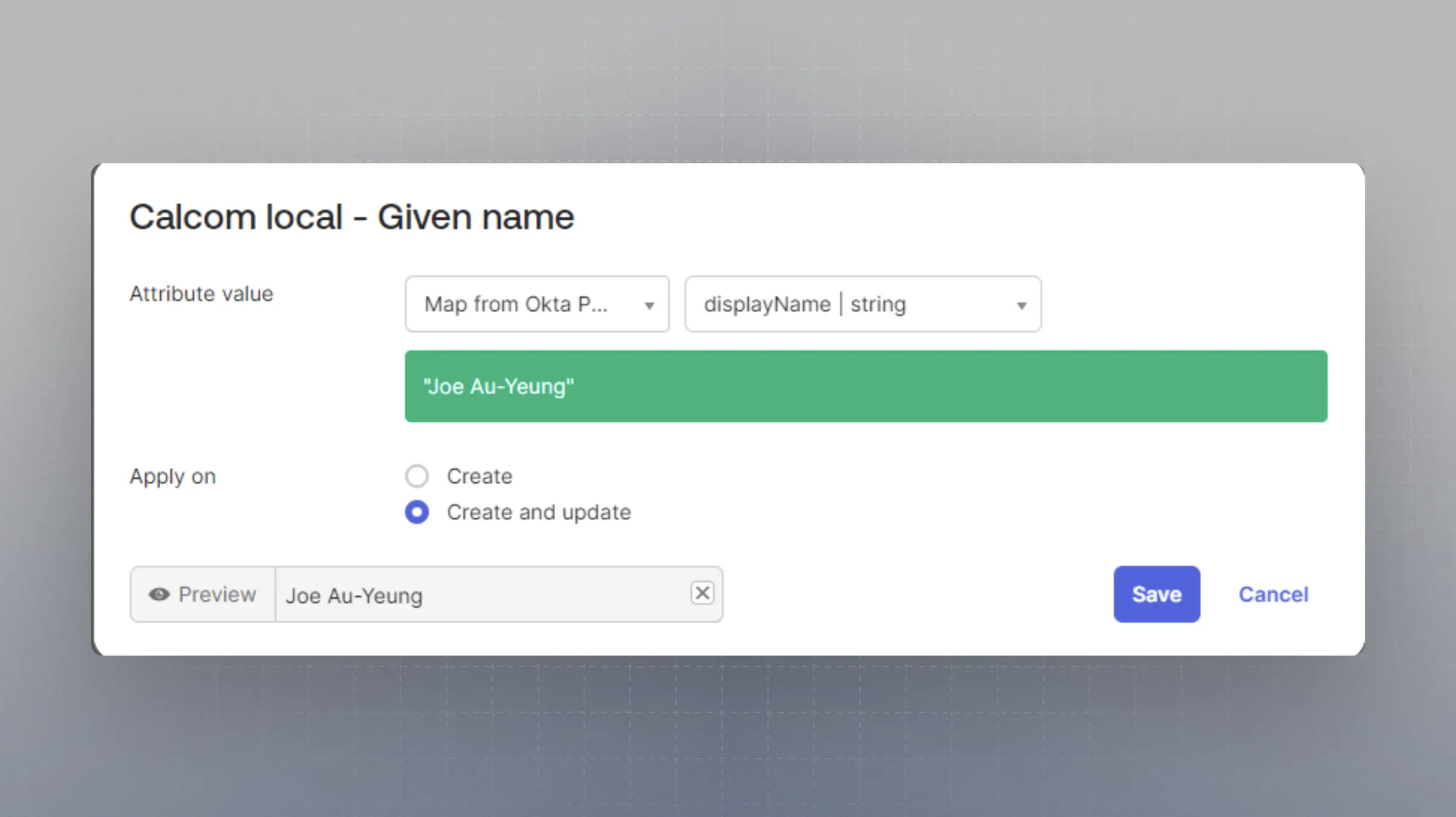 Set each of these of these properties to “Map from Okta Profile” and the related field. Under “Apply On” select “Create and Update”